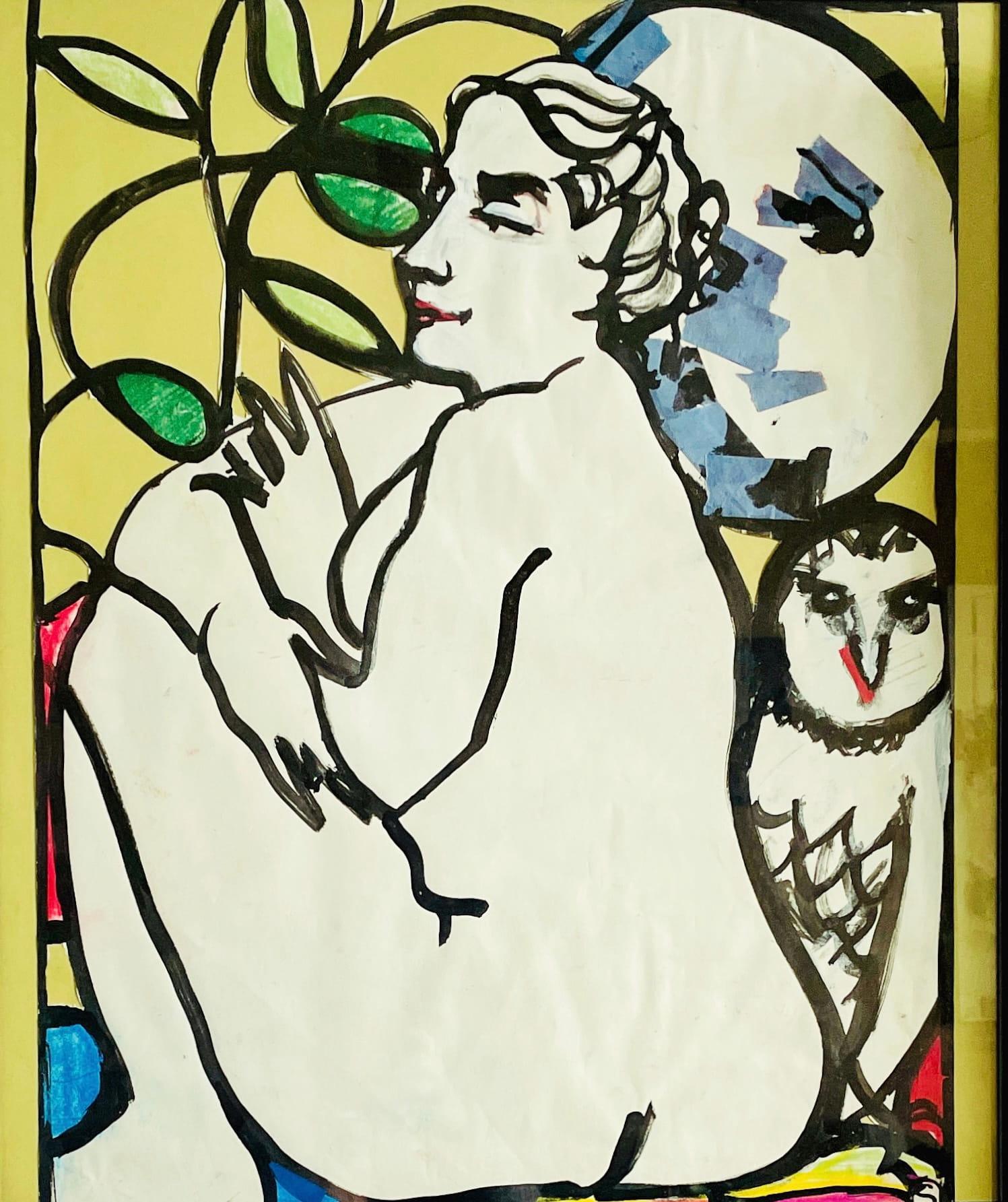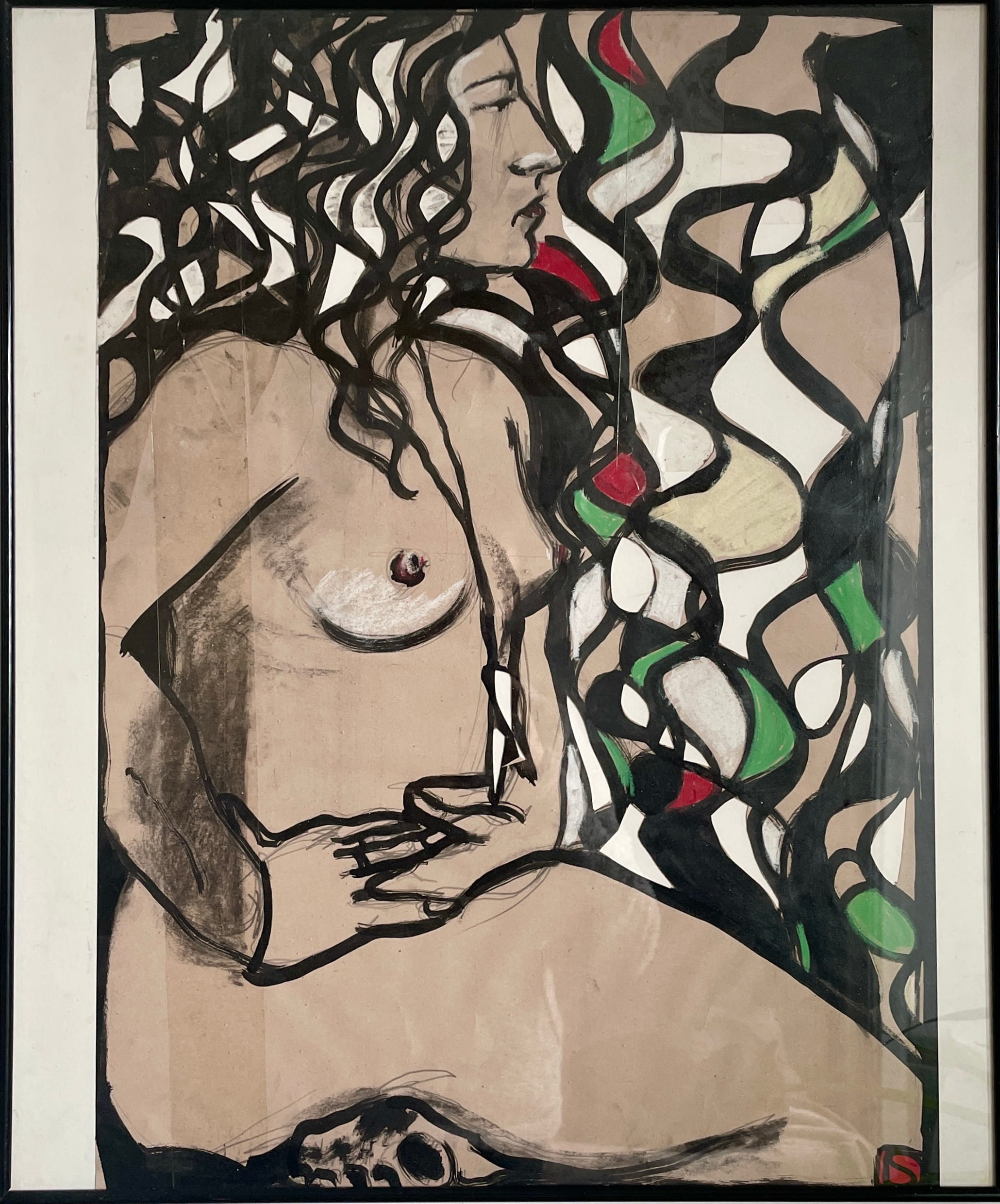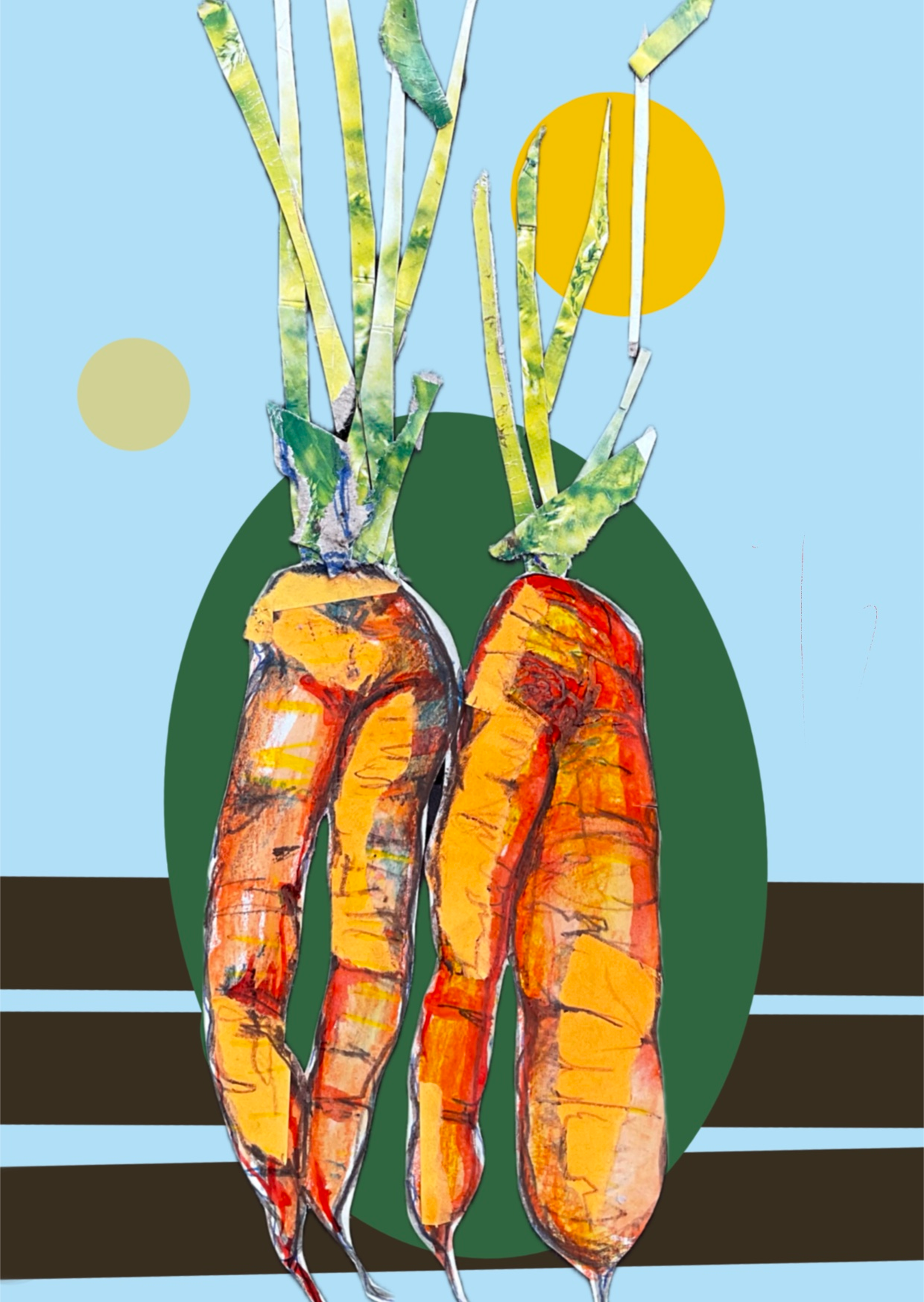Her work embraces the vibrancy of collage, weaving together layered stories through recycled paper and found materials from her surroundings.